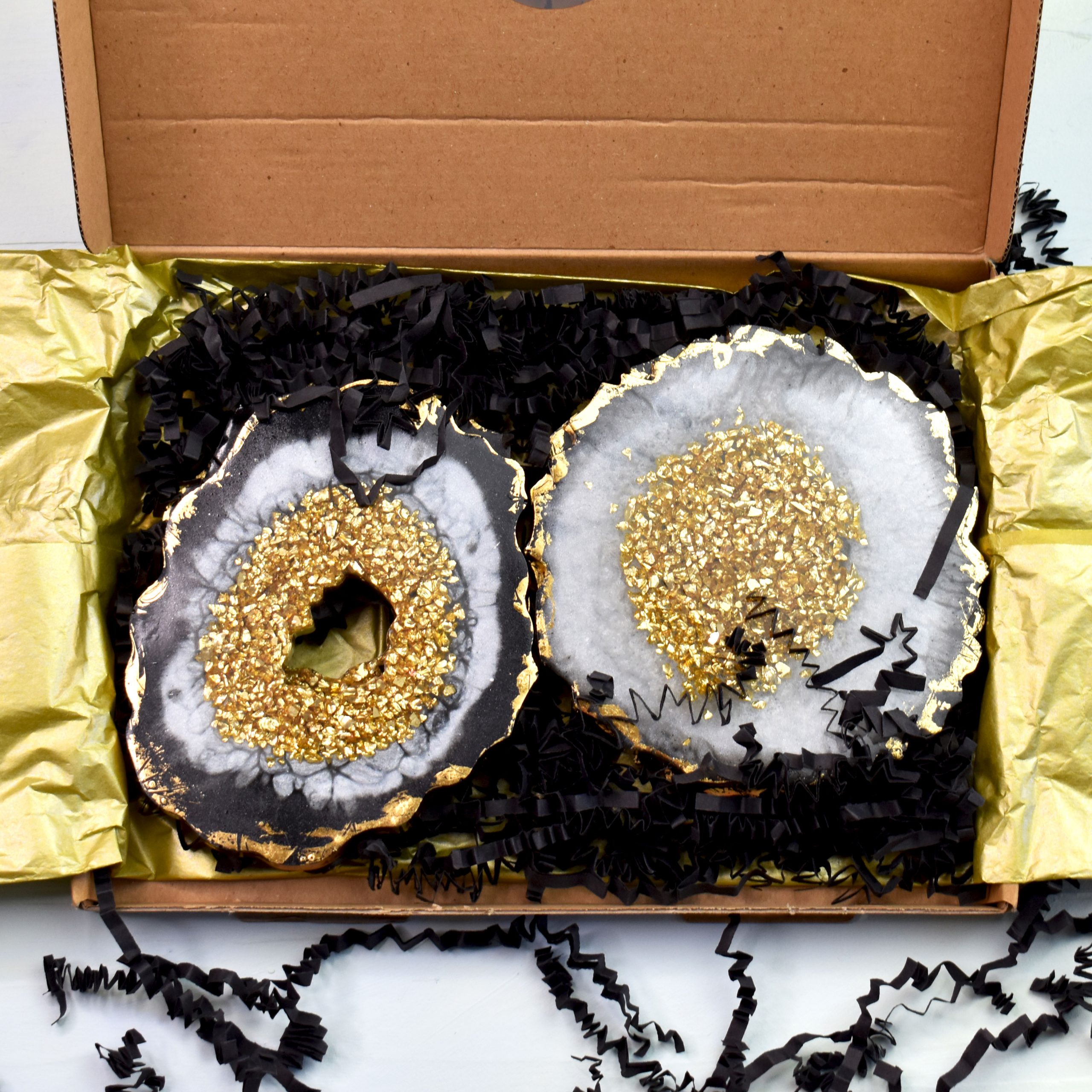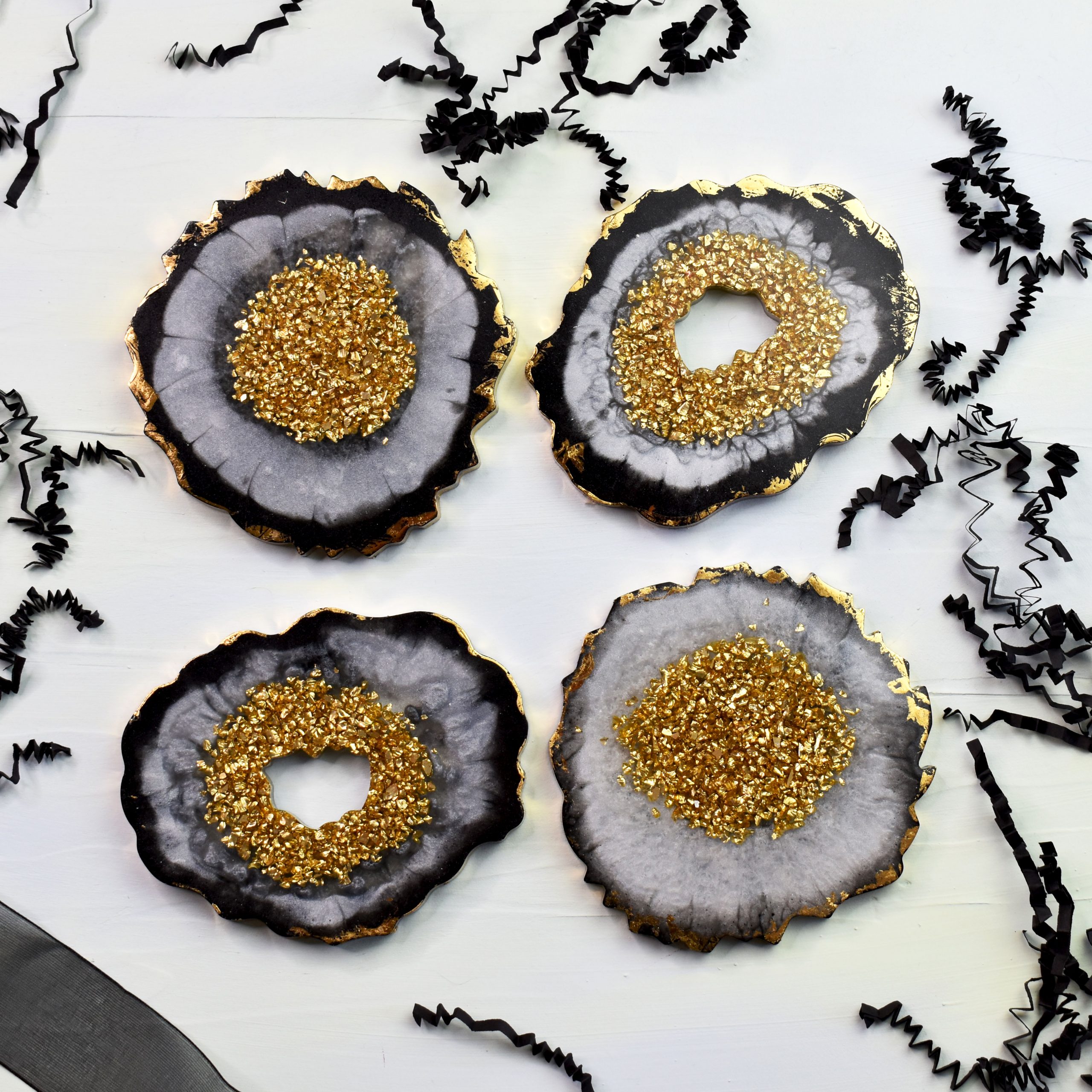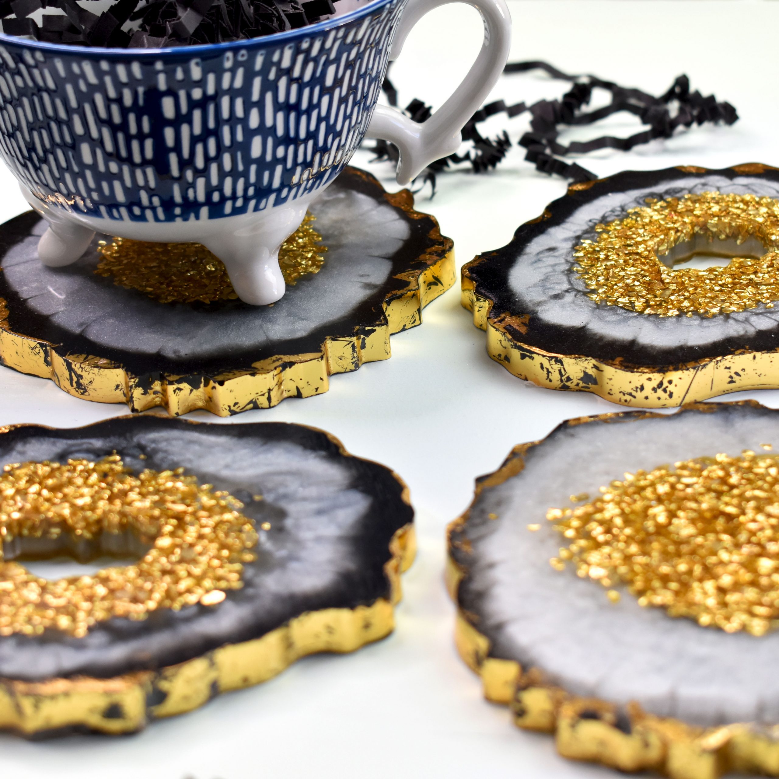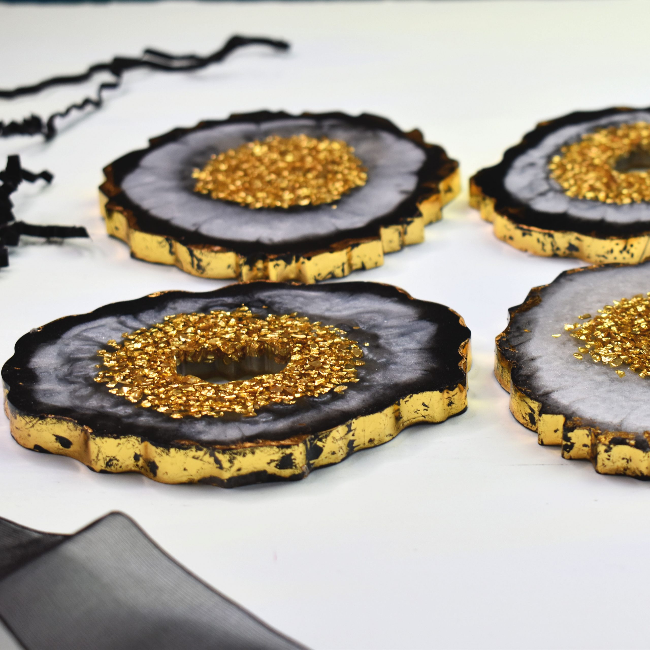 Handmade kit of 4 elegant black resin coasters. The resin coasters are made from high-quality, heat resistant resin and crushed gold coloured glass. The sides of every coaster are decorated with a gold leaf. This is an original, single made coaster set.
